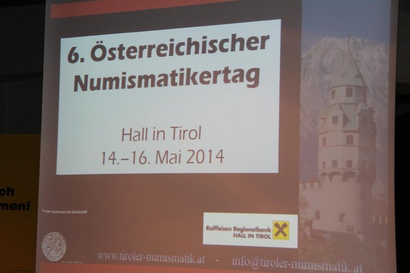 der 6. Österreichische Numismatikertag 2014 wird von der Tiroler Numismatischen Gesellschaft und der Münze Hall in Hall in Tirol in Kooperation mit dem Institut für Numismatik und Geldgeschichte der Universität Wien, der Abteilung Documenta Antiqua des Instituts für Kulturgeschichte der Antike der Österreichischen Akademie der Wissenschaften und dem Münzkabinett des Kunsthistorischen Museums Wien veranstaltet.
